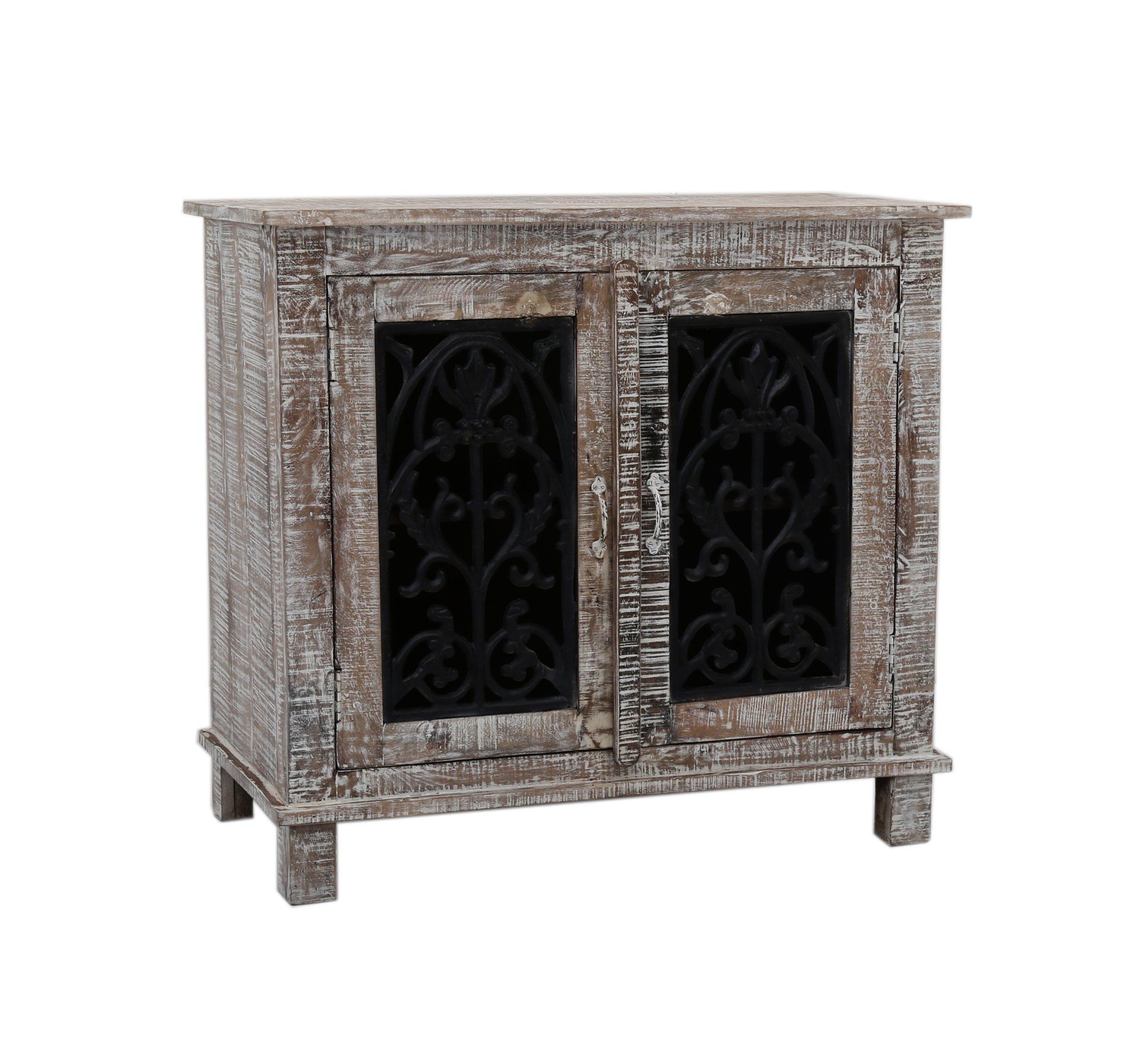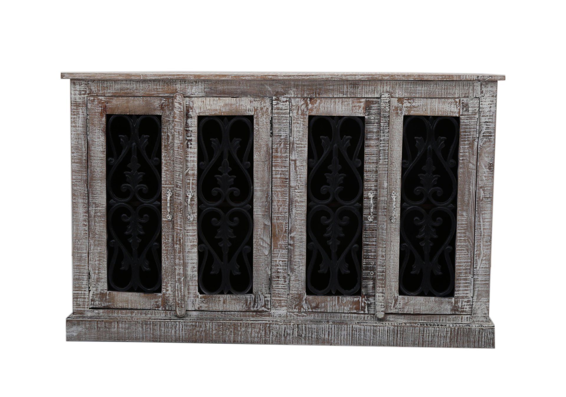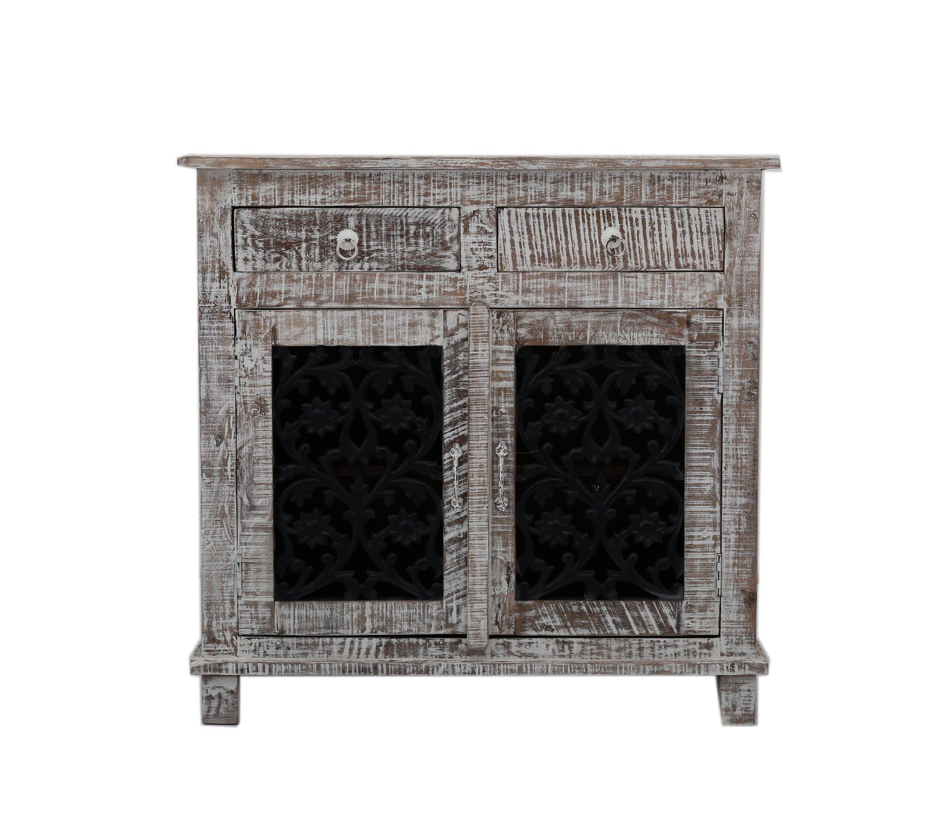 A combination of distress wood with white wash finish and decorative metal doors is the USP of this range available in options of peg legs and base rest. Available in different combination of doors and drawers. The doors are made up of coated iron designs makes this range more attractive. These are made of 100% solid mango wood with matching handles for the finish.