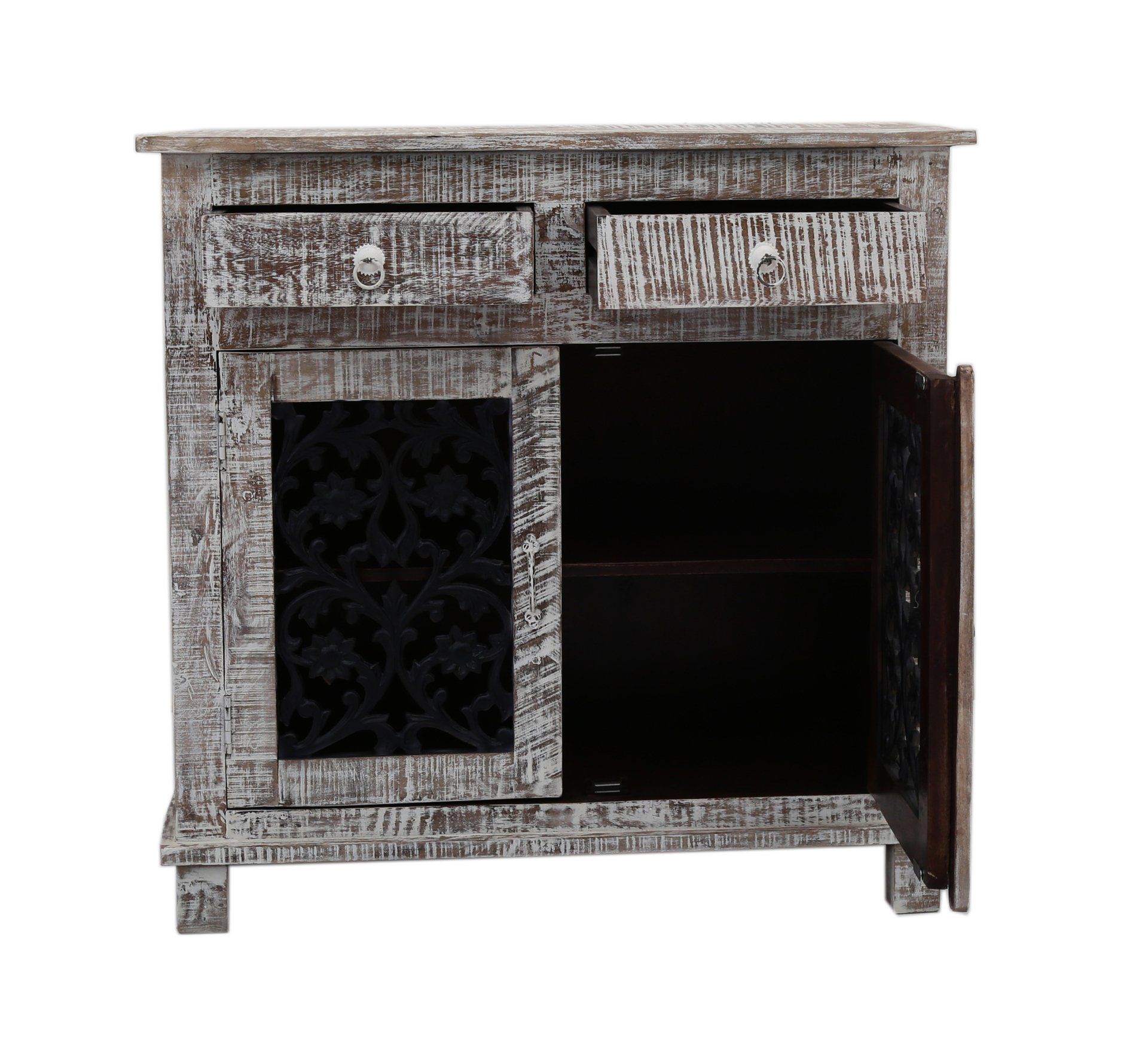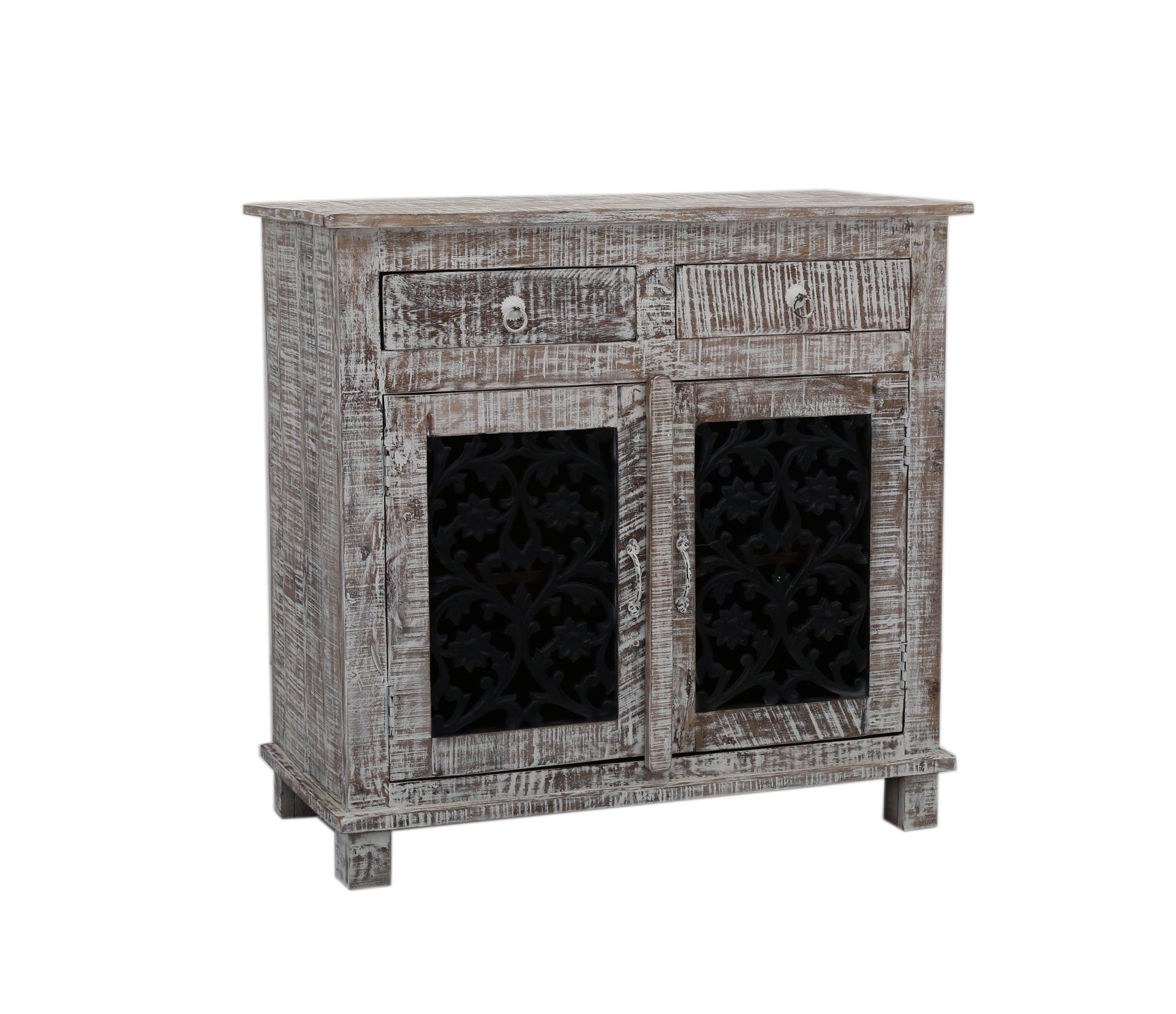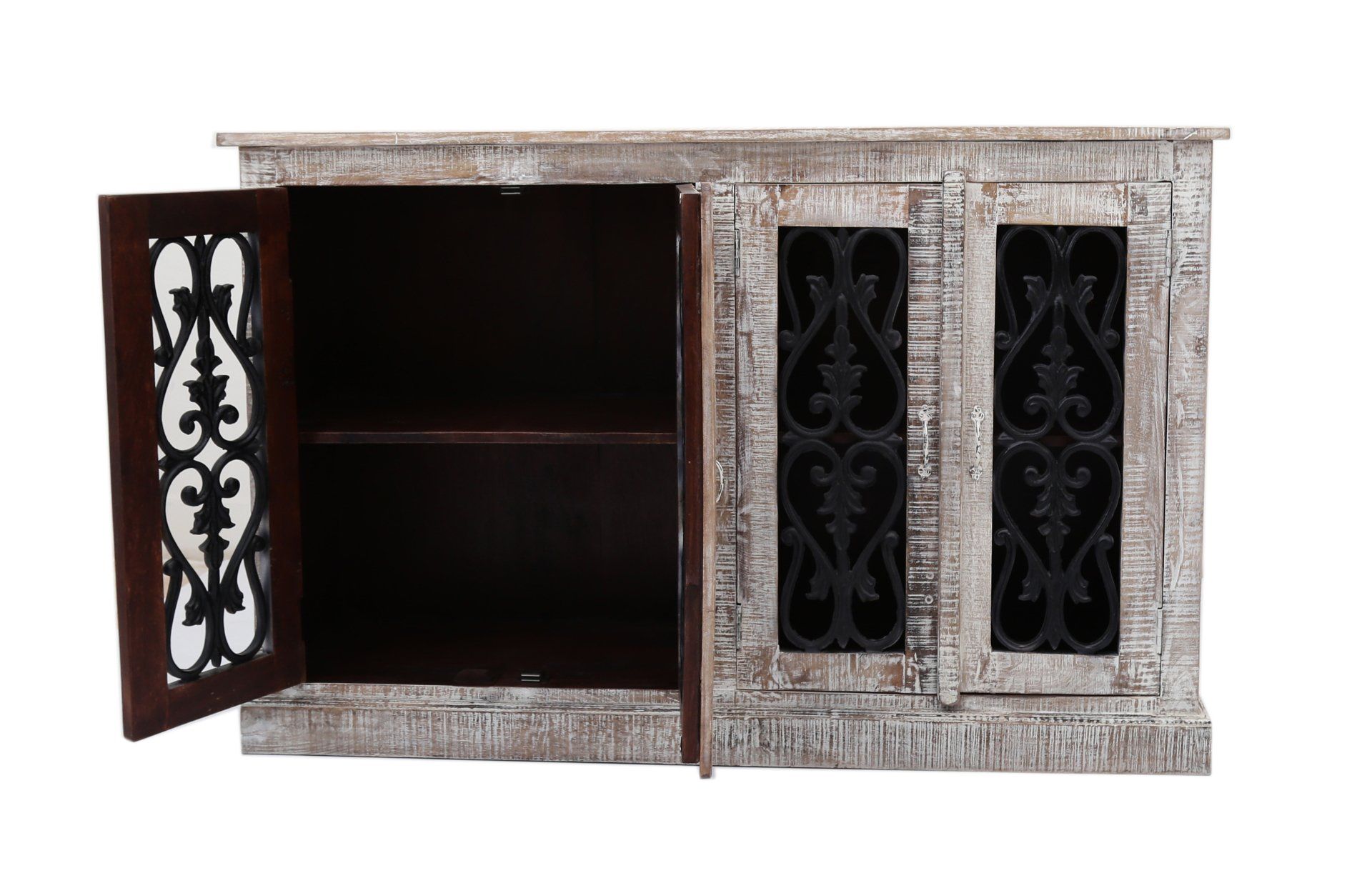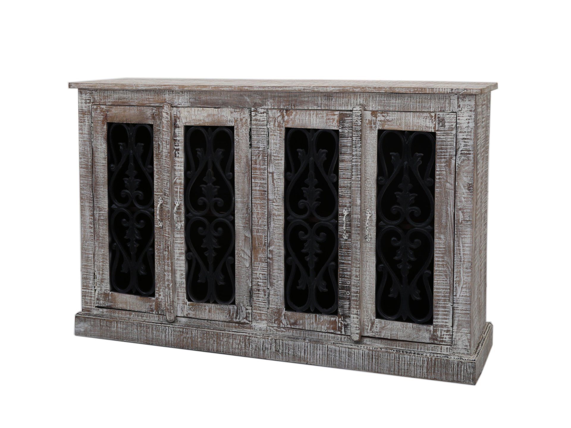 A combination of distress wood with white wash finish and decorative metal doors is the USP of this range available in options of peg legs and base rest. Available in different combination of doors and drawers. The doors are made up of coated iron designs makes this range more attractive. These are made of 100% solid mango wood with matching handles for the finish.