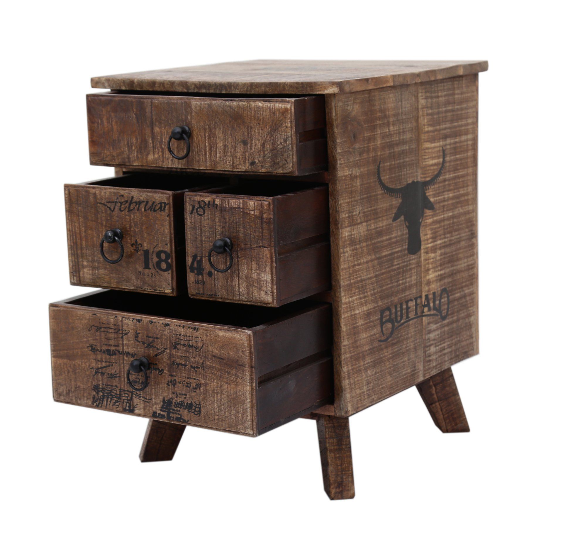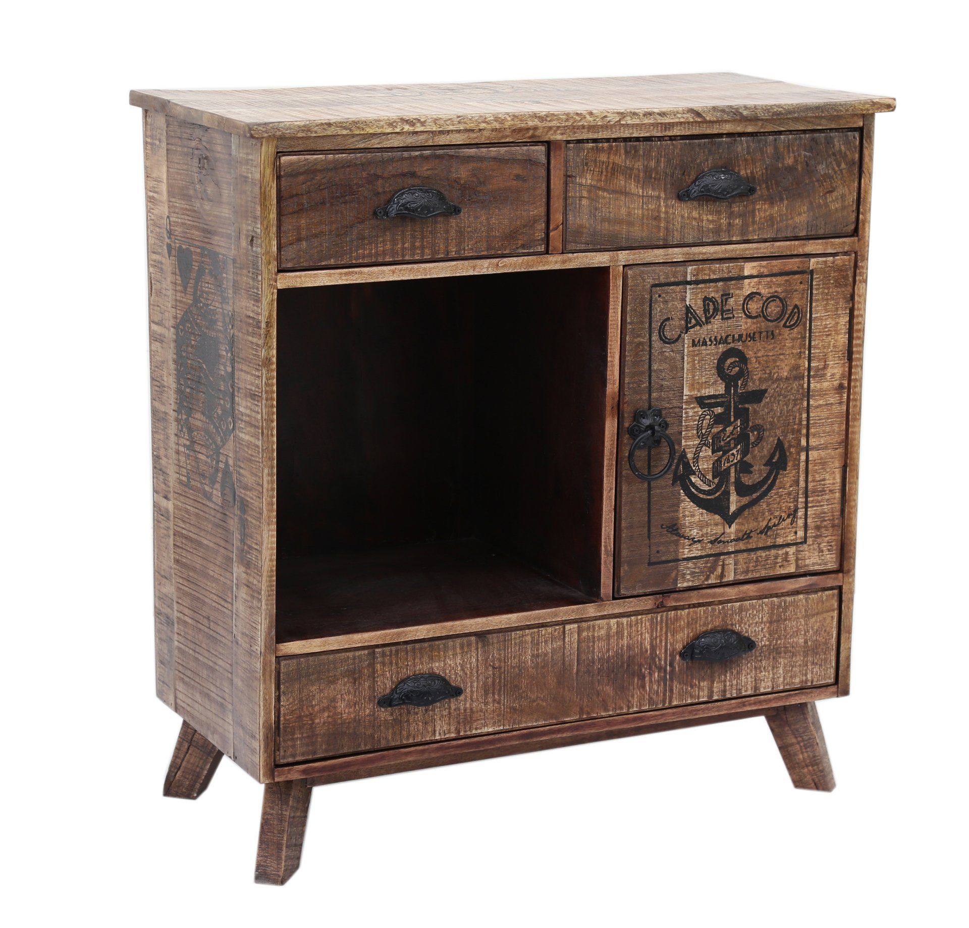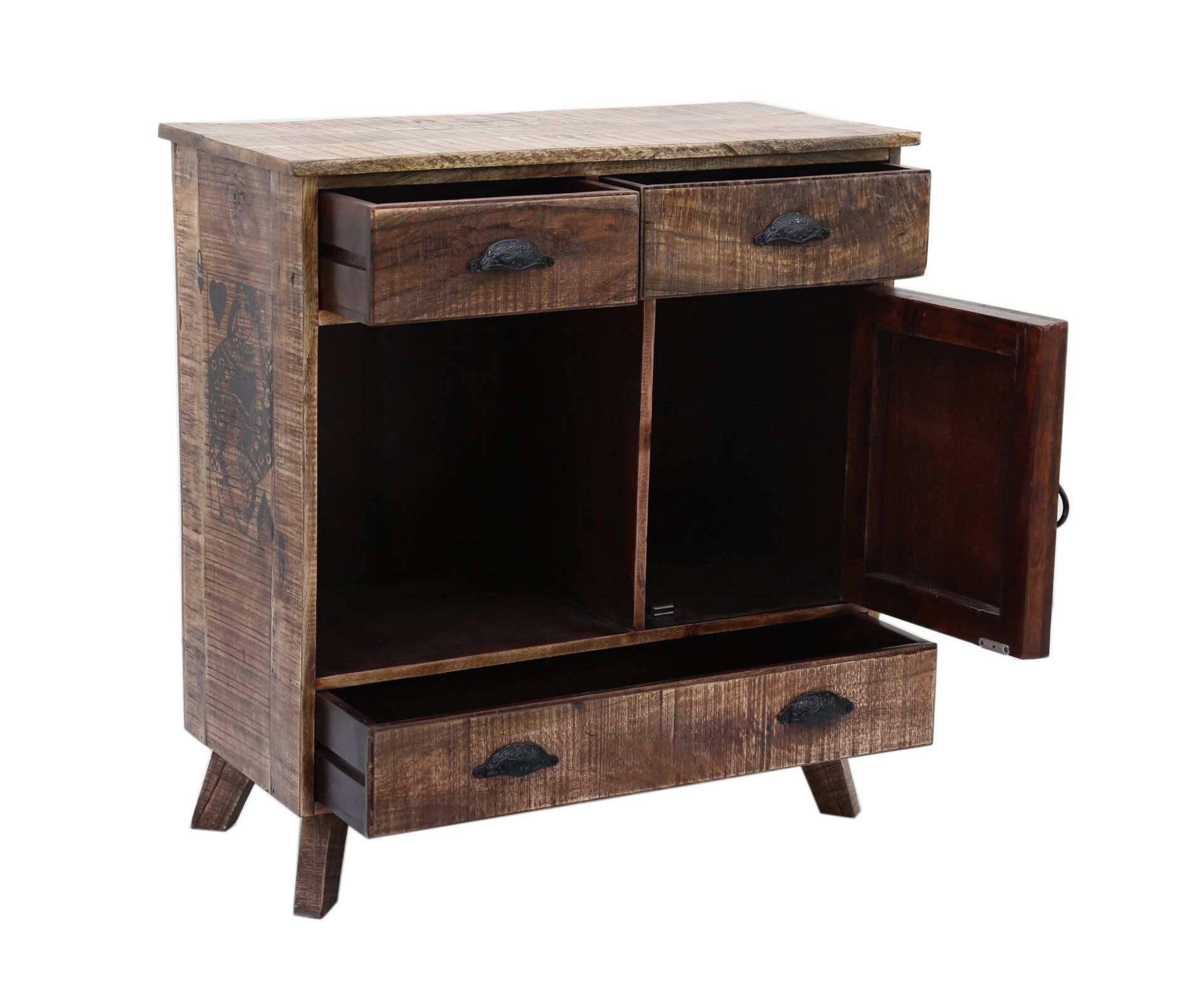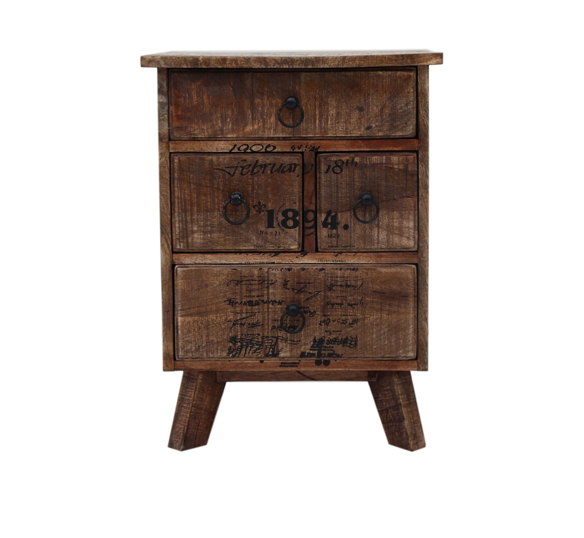 Natural solidwood with rustic look. The black prints on the wood with the country theme, with angled legs and compatible handles makes this range attractive to the living space. A combination of drawers and doors fits these chests in bed room, living room and dinning space