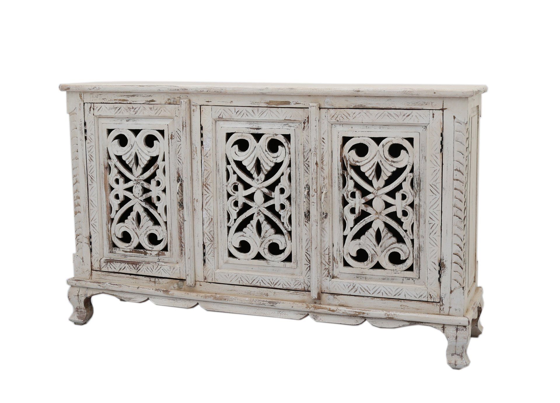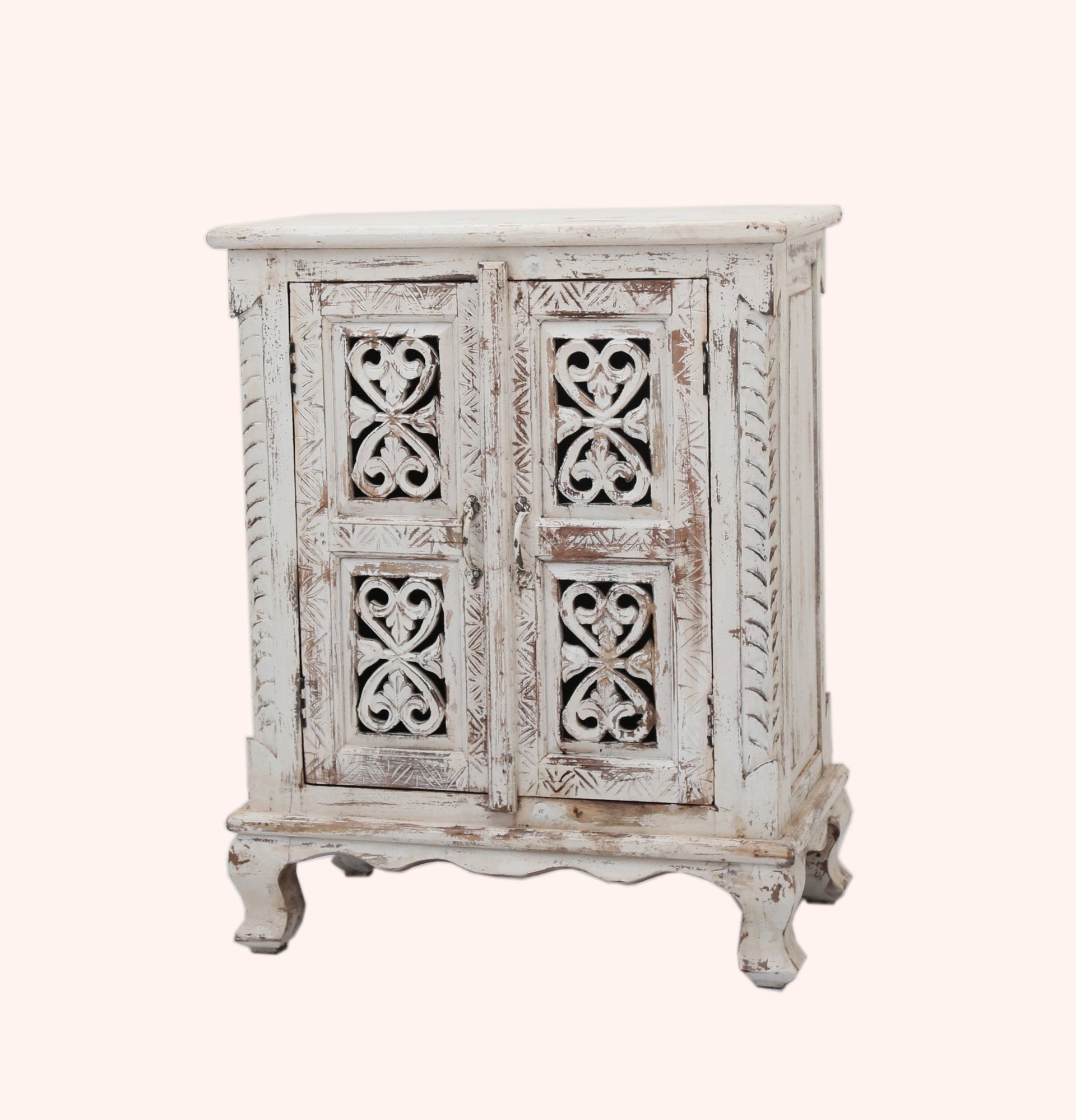This carving doors and shabby chic finish makes this product unique. The designs are carved by artisans. The compatible handles, and french style of legs are the USP of this product. The carvings are given a shabby chic finish to make it attractive to the living space, hallway and bed room. The product is made of 100% solid mango wood.